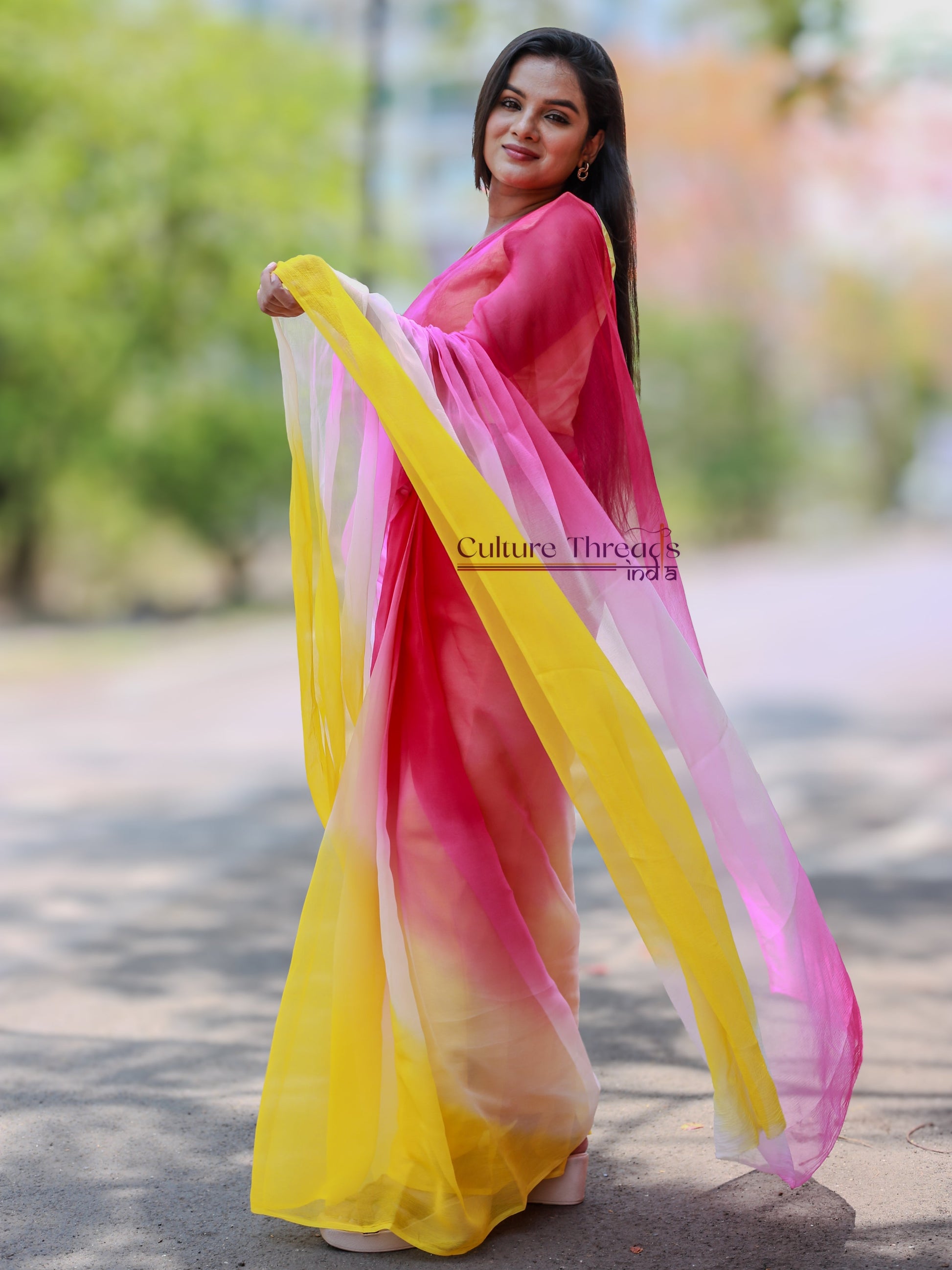 Embrace the magic of vibrant hues, the delicate flow of chiffon, and the allure of timeless elegance with our stunning pink, white, and yellow shaded chiffon saree. Let your style bloom with the beauty of a sunrise, and captivate hearts with every graceful step.