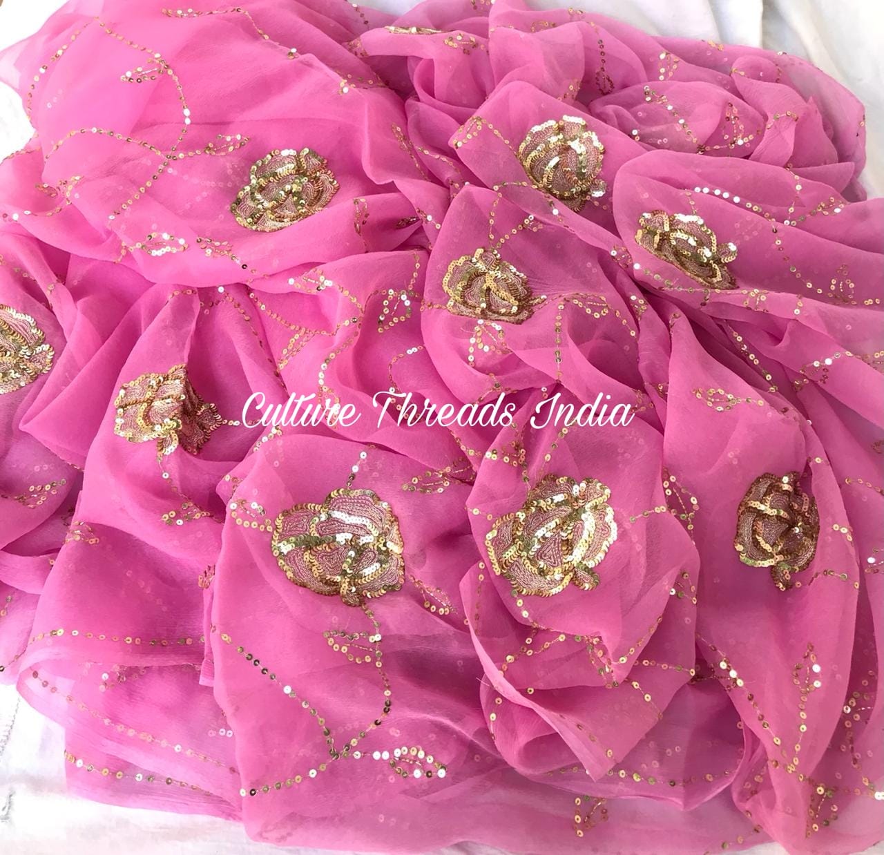 Chiffon is a delicate and lightweight fabric known for its sheer and elegant drape. Please be aware that due to the nature of chiffon, minor irregularities such as pulls, snags, or variations in weave may occur, adding to the character of the saree.While we take great care to ensure the quality and durability of these embellishments, they may require gentle handling to avoid damage.