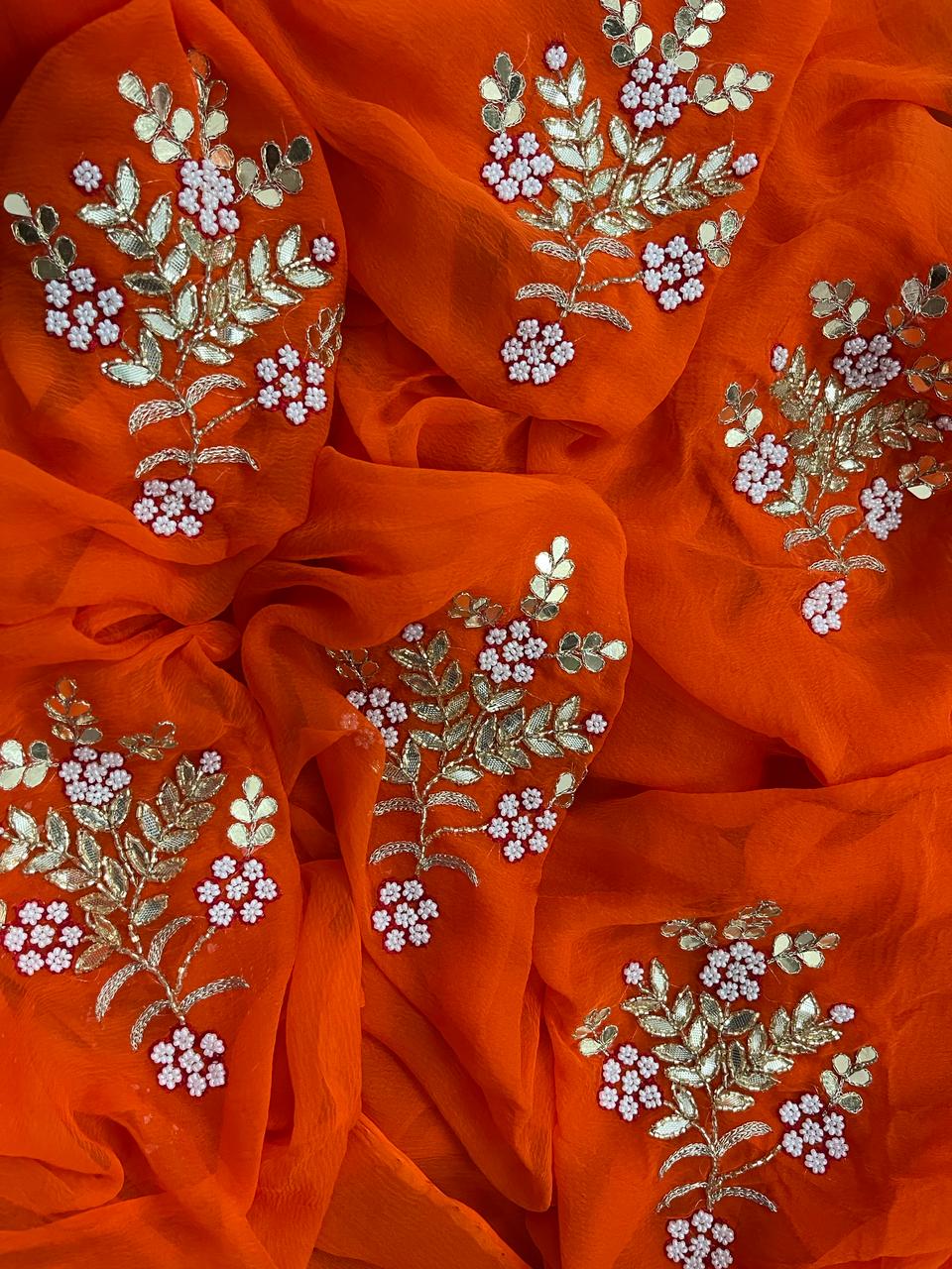 Chiffon is a delicate and lightweight fabric known for its sheer and elegant drape. Please be aware that due to the nature of chiffon, minor irregularities such as pulls, snags, or variations in weave may occur, adding to the character of the saree.While we take great care to ensure the quality and durability of these embellishments, they may require gentle handling to avoid damage.