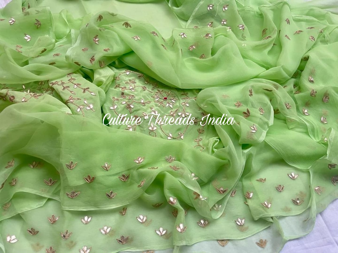 Embrace the delicate beauty of the morning dew and adorn yourself in the Dewy Pistachio Gota Saree, a symbol of timeless sophistication and refined taste.
