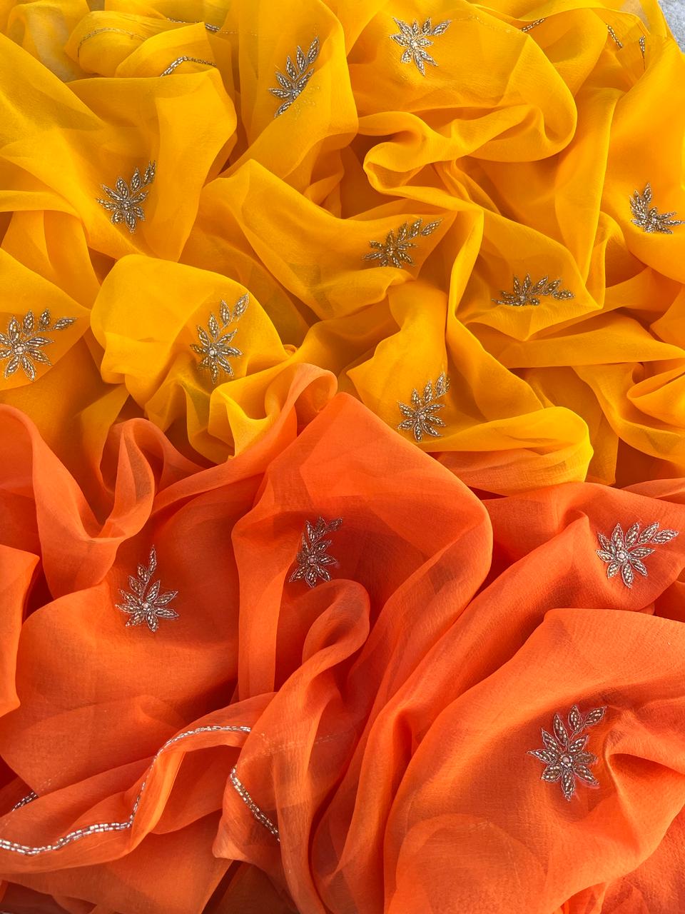 "Step into the world of timeless elegance with our Honeydew Blossom Charm saree, a beautiful blend of yellow and orange hues that evoke the warmth of a glowing sunrise. This masterpiece is adorned with intricate cutdana flower motifs that shimmer delicately with every movement, reflecting the art of fine craftsmanship. The rich gradient of colors symbolizes vibrance and positivity, while the delicate floral accents add a touch of nature’s beauty to your ensemble. Perfect for festive occasions or intimate gatherings, this saree embodies grace, charm, and sophistication, making you feel like the epitome of elegance with every drape."