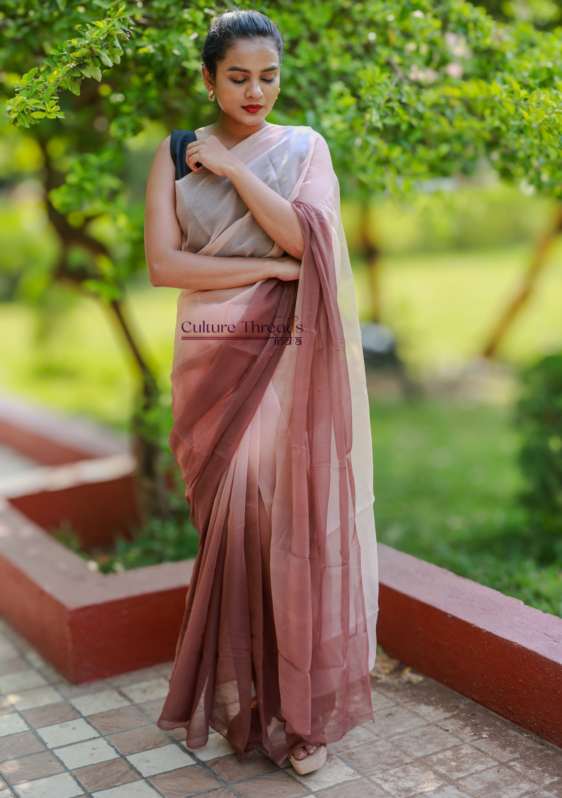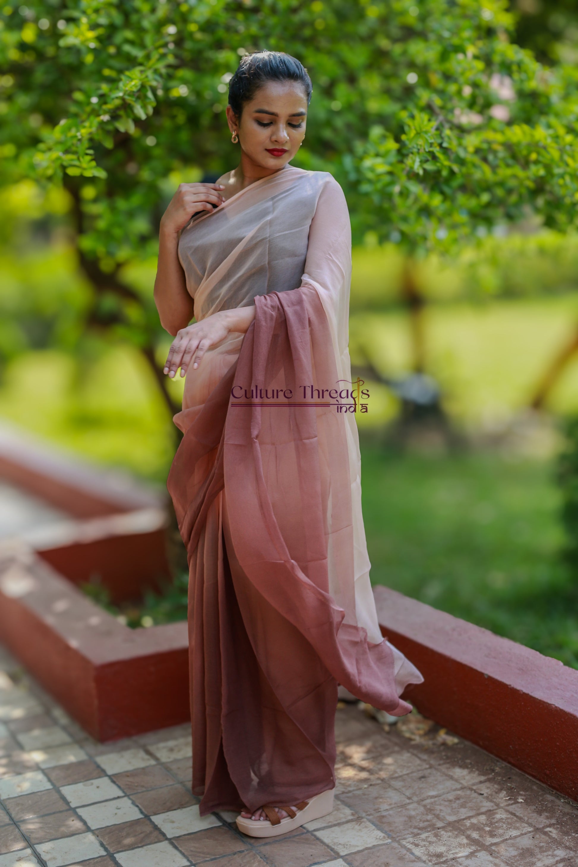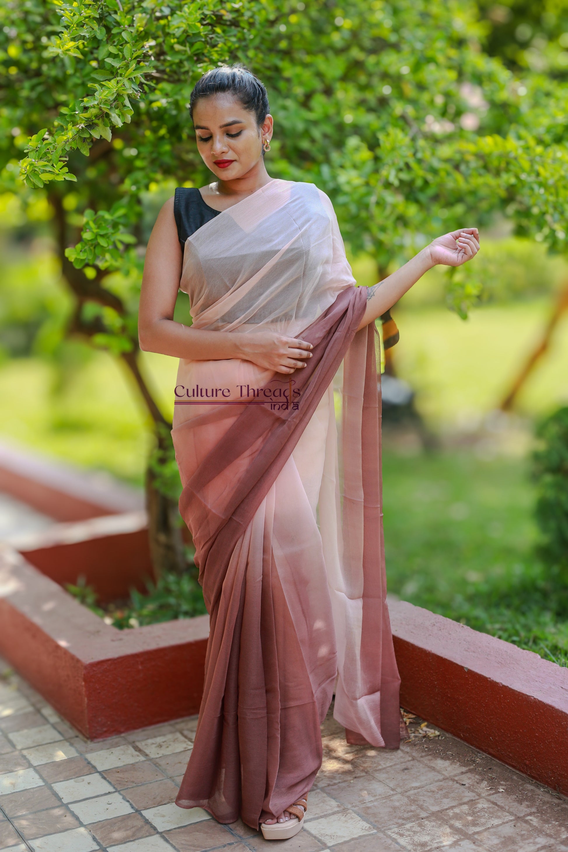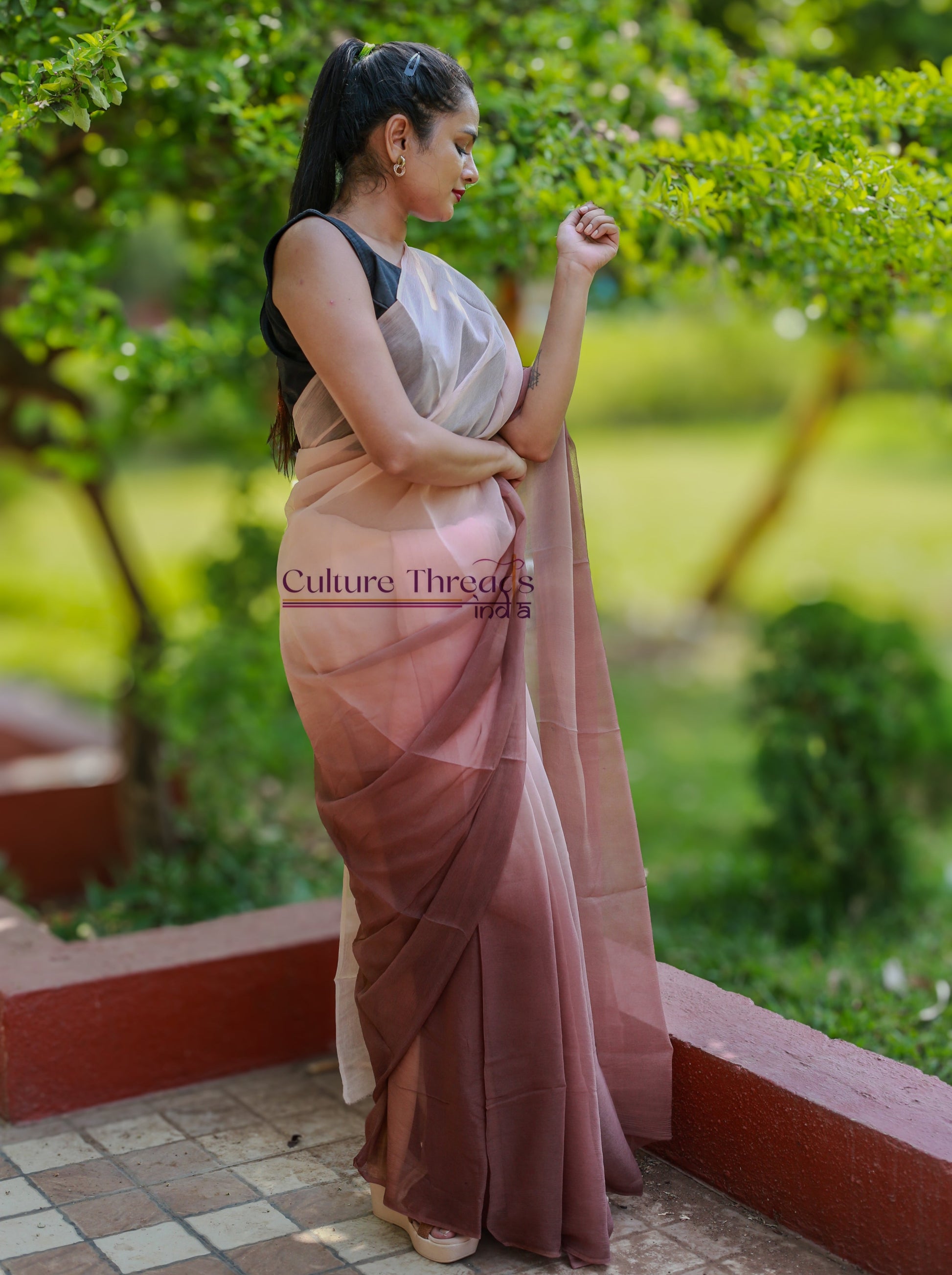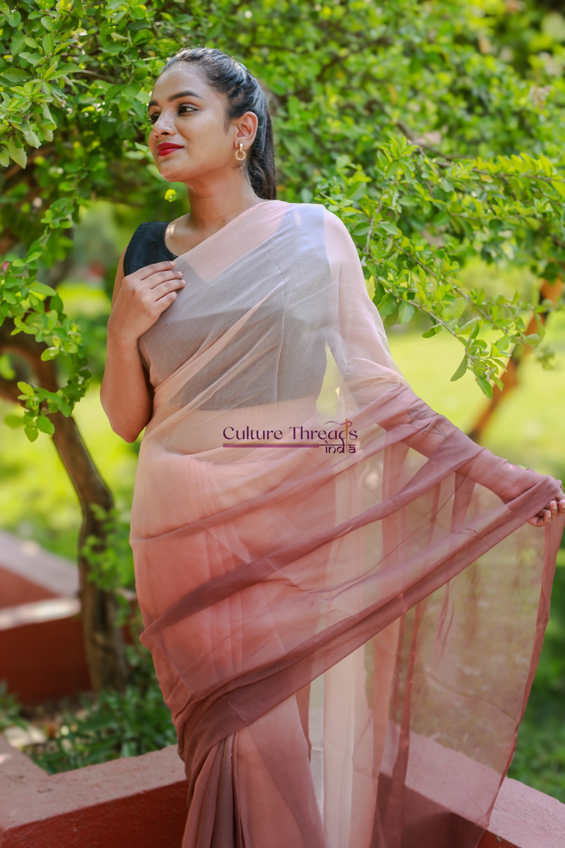 Embrace the timeless allure of sophistication with our exquisite off-white and brown shaded chiffon saree. This elegant piece is a harmonious blend of classic shades, capturing the essence of understated luxury and refined grace. The subtle transition from soft off-white to rich brown creates a mesmerizing ombré effect, reminiscent of a tranquil dusk sky meeting the earth.