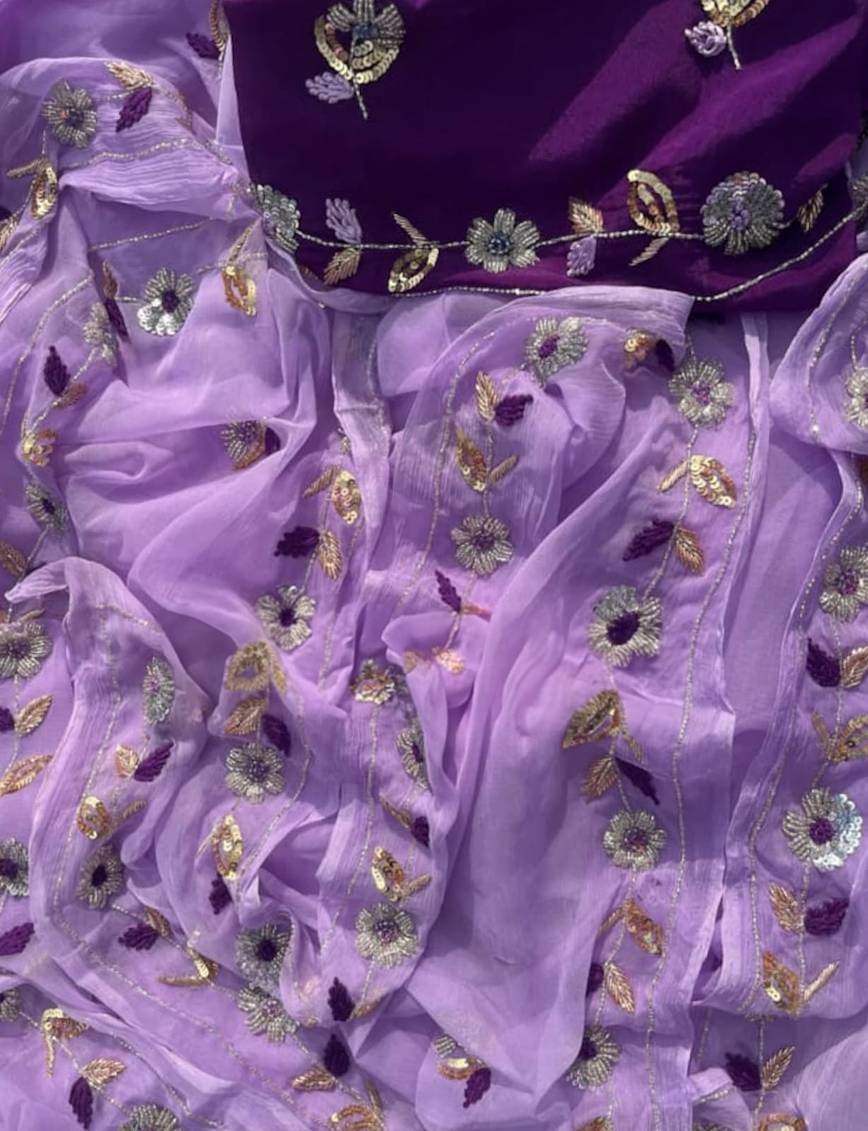 "Step into a world of serene charm and effortless grace with this captivating lavender saree, delicately adorned with a floral border that blossoms with sophistication. The soft, pastel hue of lavender evokes a sense of calm and tranquility, while the intricately designed floral border frames the saree like a garden in full bloom, adding a touch of nature’s elegance to your ensemble. Perfect for both daytime celebrations and evening soirées, this saree beautifully blends modern refinement with traditional allure. Whether paired with statement jewelry or kept minimal for a chic look, this piece radiates poise and femininity. Drape yourself in this lavender dream and let the delicate florals bring a fresh, romantic essence to your every move, making every occasion a picturesque moment of style and grace."