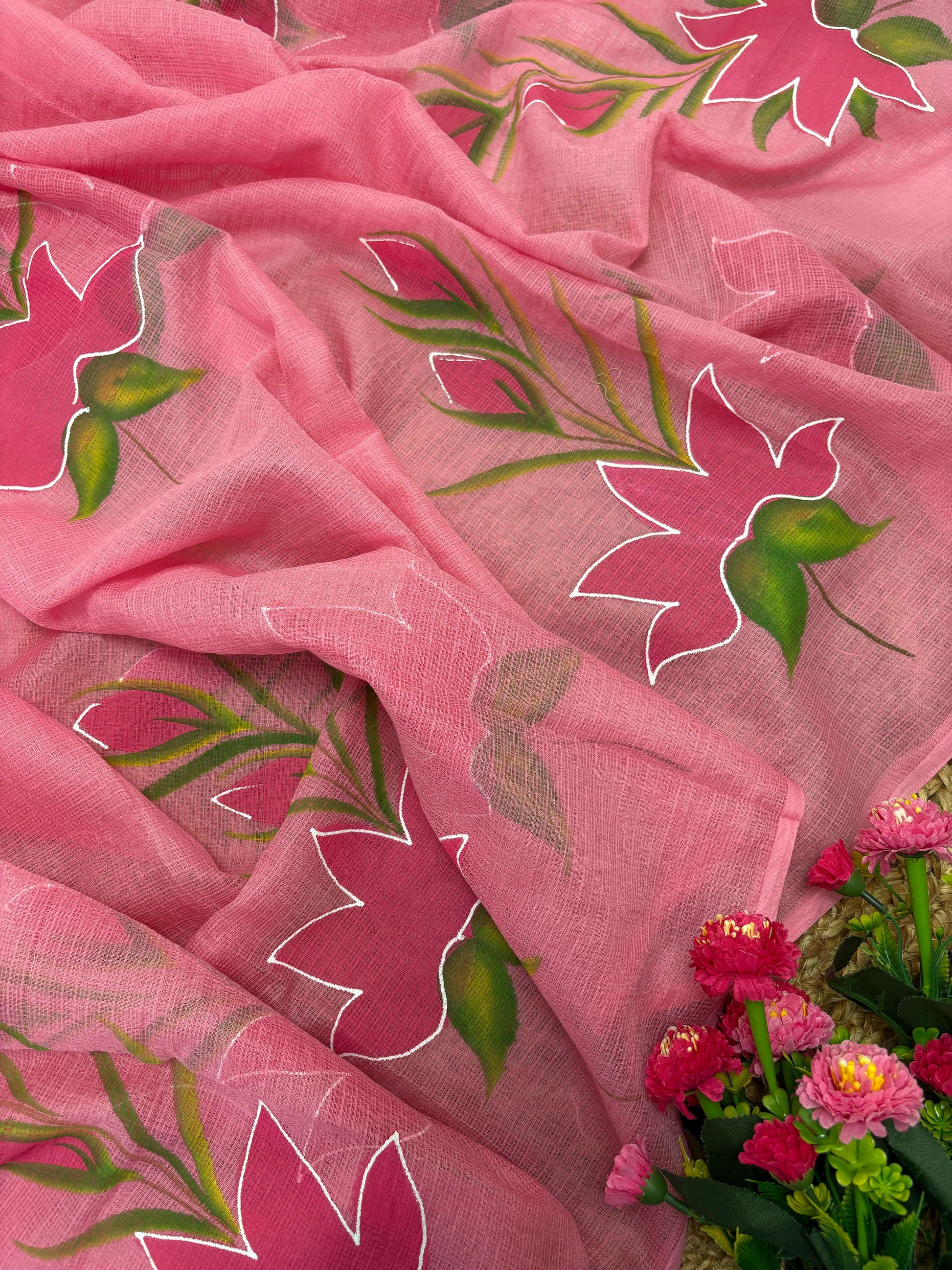 Embrace the ethereal beauty of this exquisite Kota Doria saree, delicately handpainted with soft lotus motifs in serene shades of pink. Crafted with sheer elegance, the lightweight fabric drapes effortlessly, offering both comfort and style. The dreamy floral design evokes a sense of calm and grace, making this saree a perfect choice for those special occasions where you wish to leave a lasting impression.