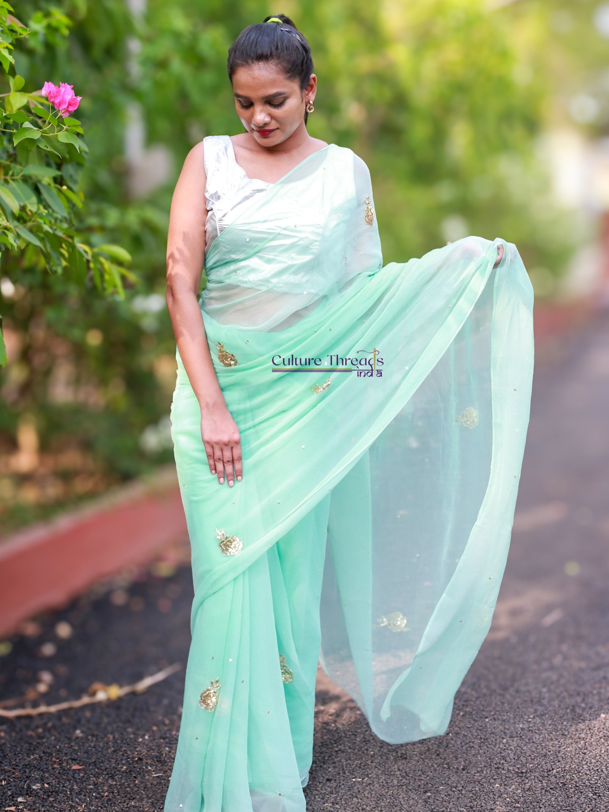 Introducing the Pistachio Bloom Saree, an enchanting ensemble that embodies the delicate beauty of nature's verdant landscapes. Crafted from luxurious chiffon fabric in a soothing pistachio hue, this saree captures the essence of tranquility and elegance.