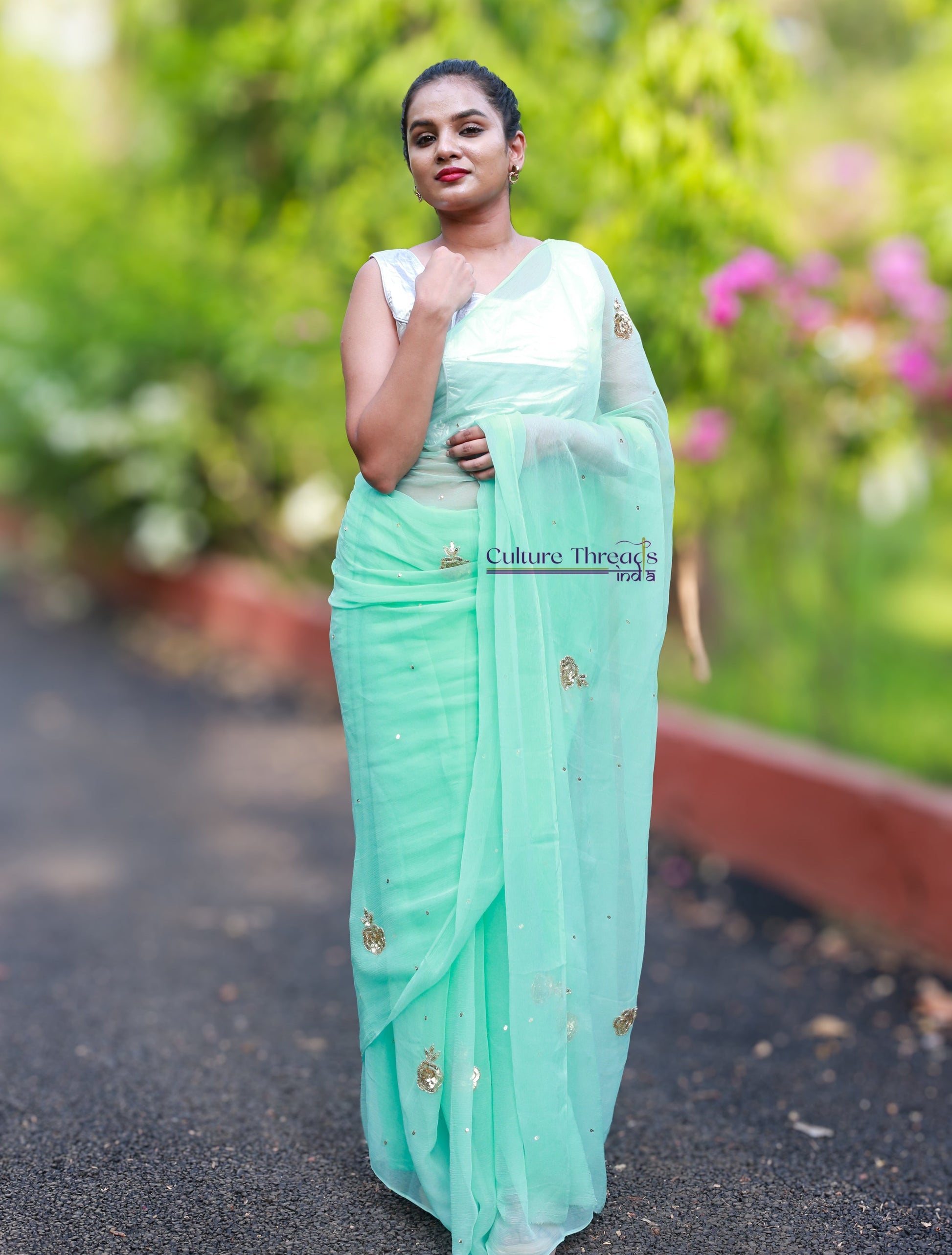 Adorned with intricate flower motifs delicately embroidered throughout the fabric, each bloom adds a touch of whimsy and grace to the ensemble. The Pistachio Bloom Saree drapes effortlessly, enhancing the wearer's silhouette with its fluidity and charm.