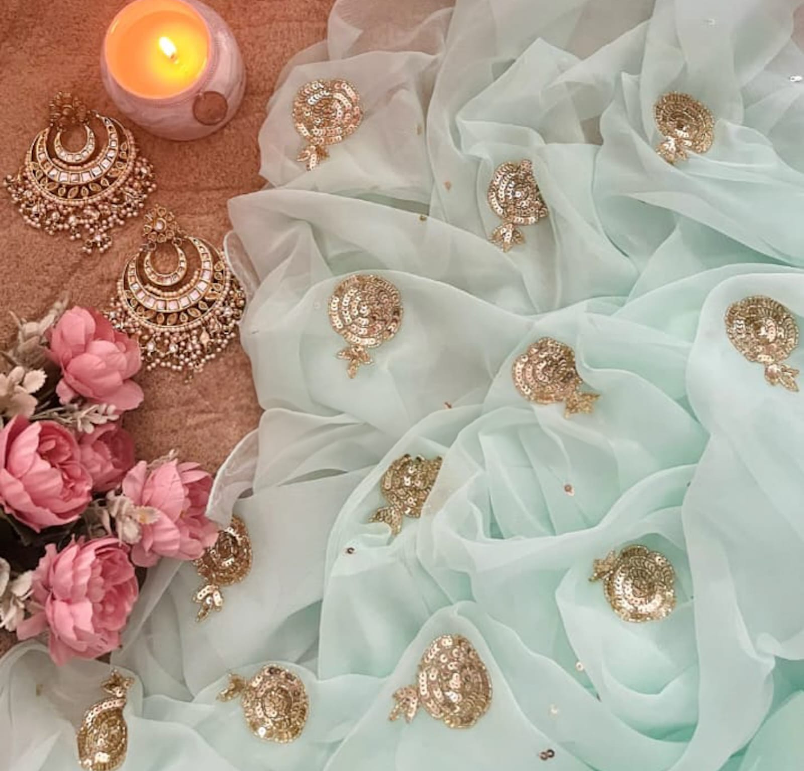 Chiffon is a delicate and lightweight fabric known for its sheer and elegant drape. Please be aware that due to the nature of chiffon, minor irregularities such as pulls, snags, or variations in weave may occur, adding to the character of the saree. While we take great care to ensure the quality and durability of these embellishments, they may require gentle handling to avoid damage.