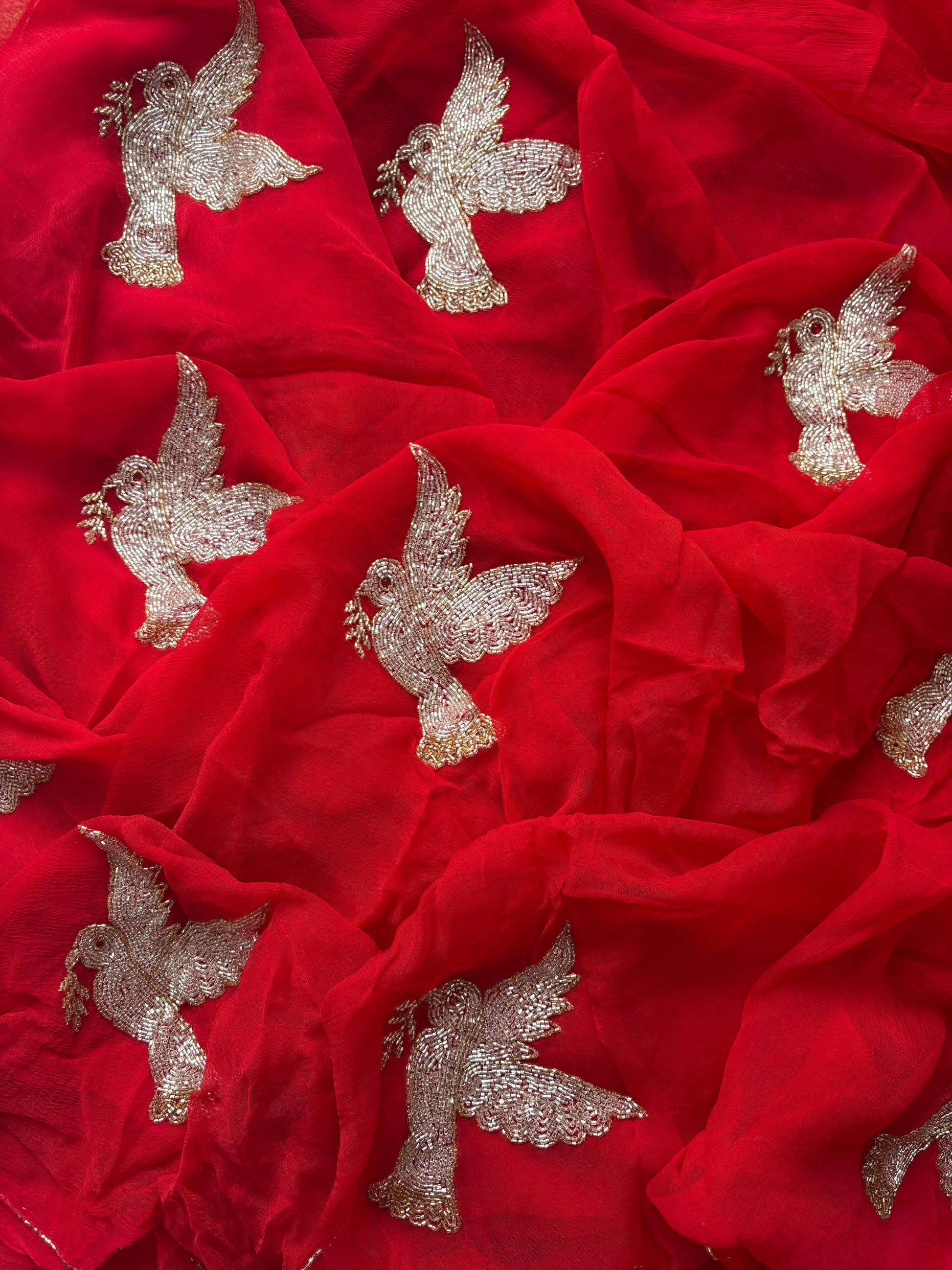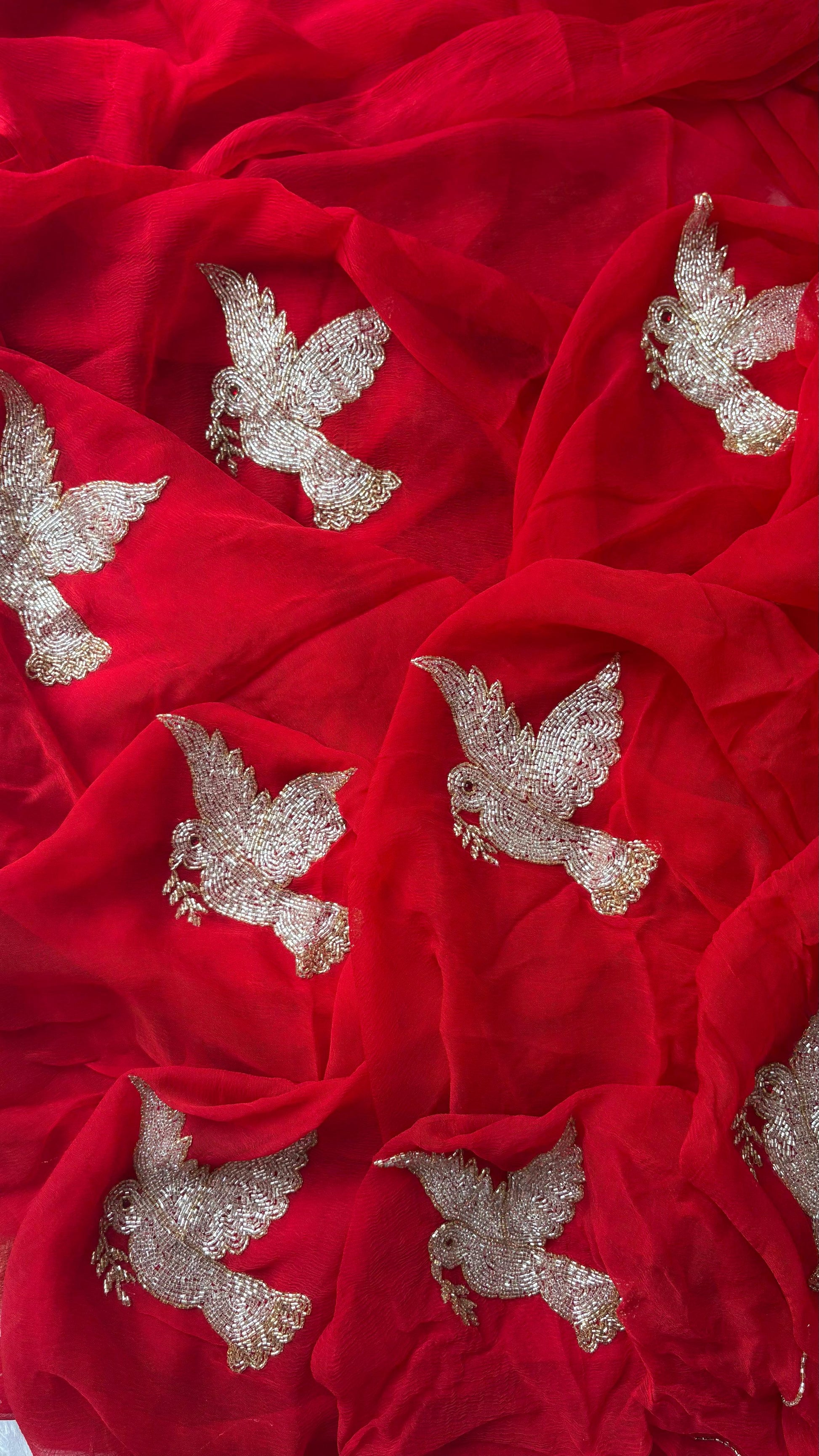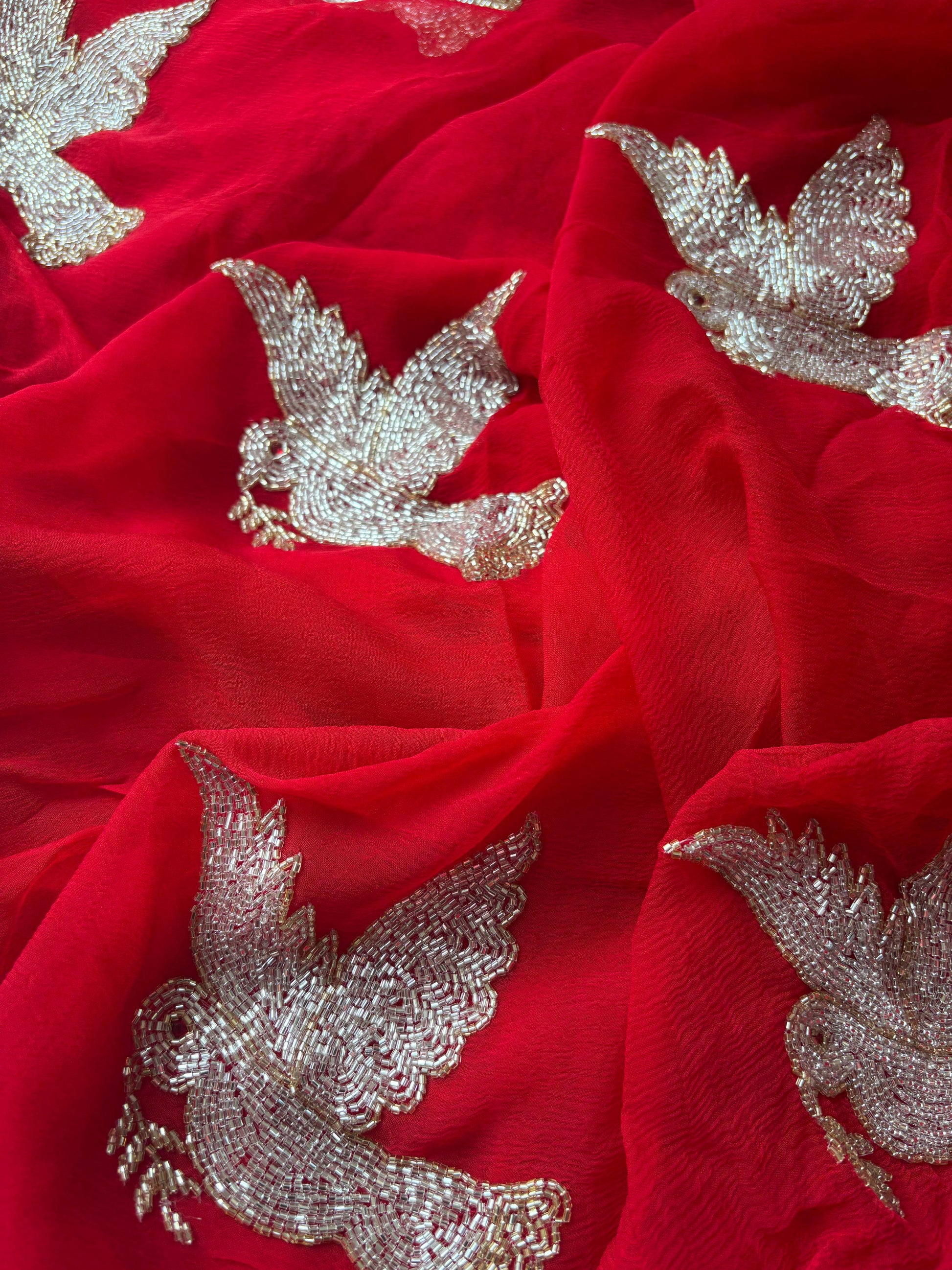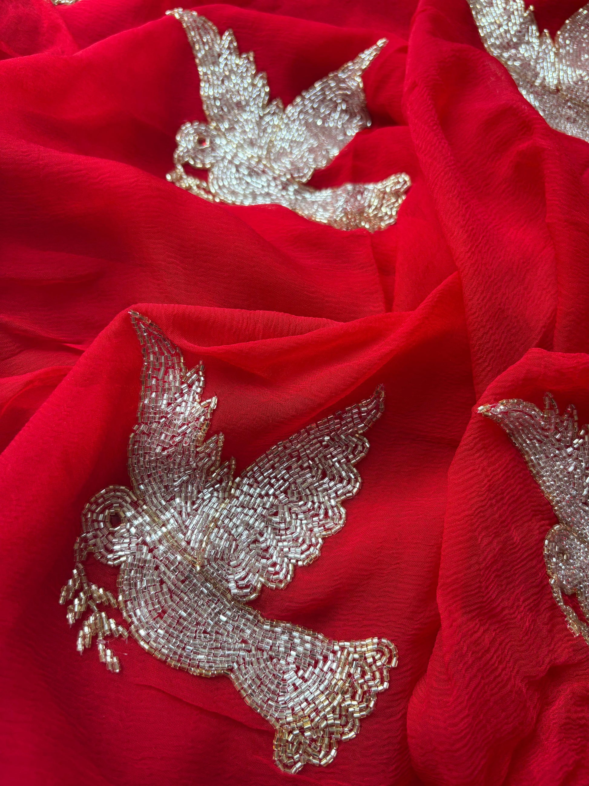 Red Hummingbird Chiffon Saree – A Symphony of Elegance and Grace