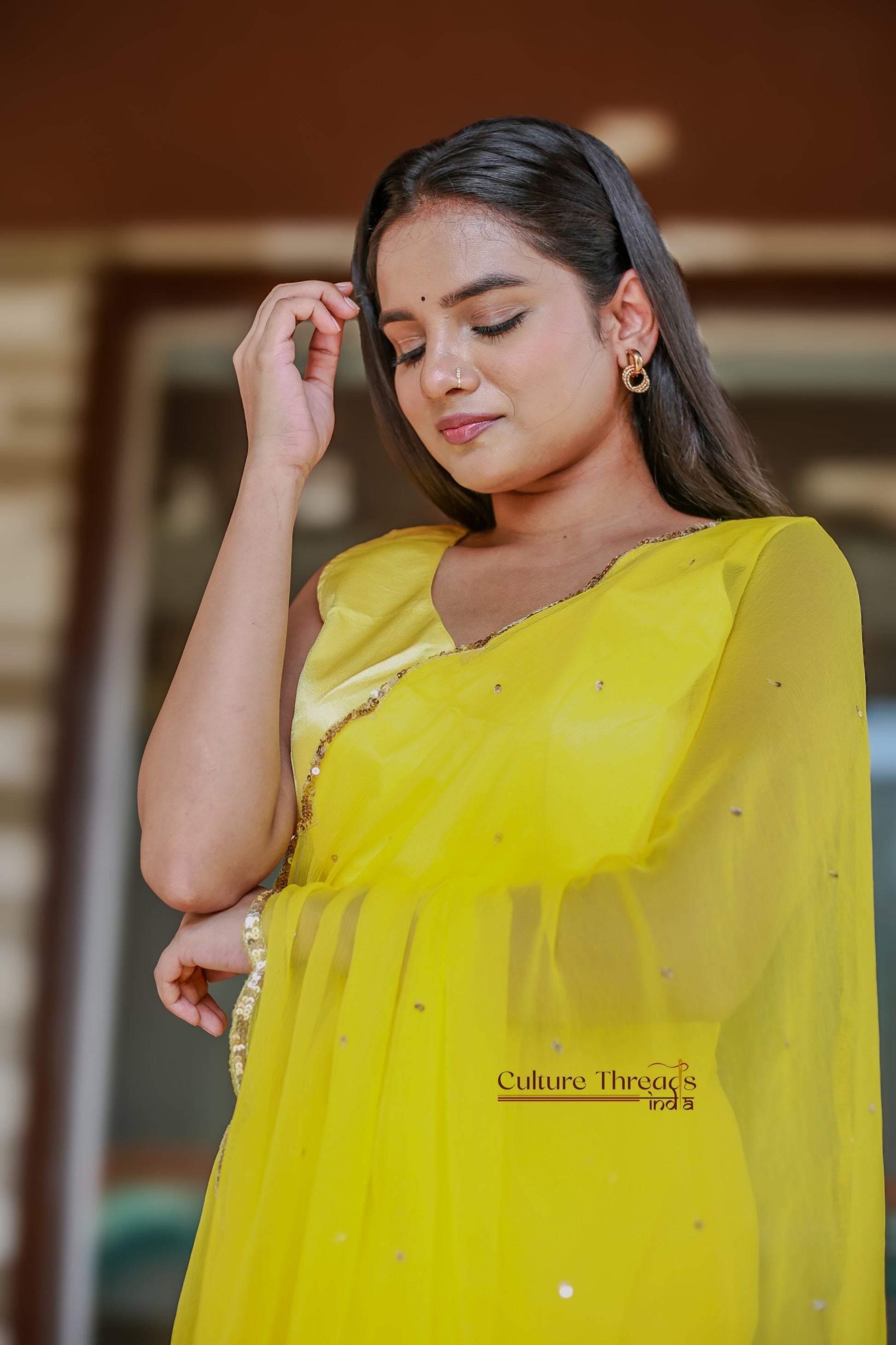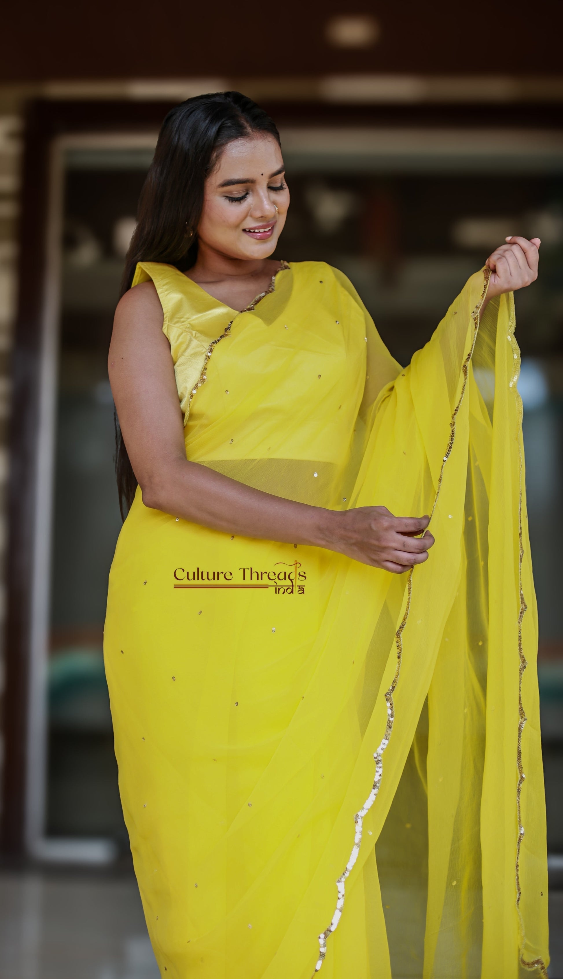 The "Sunshine Radiance Scalloped Border Saree" is a vibrant and elegant ensemble that features a sunny yellow color with a beautifully detailed scalloped border. This saree exudes warmth and charm, reminiscent of a bright and cheerful day. Perfect for festive occasions or celebrations, it adds a touch of sophistication and style to any event. Embrace the radiant beauty of this saree and shine brightly wherever you go.