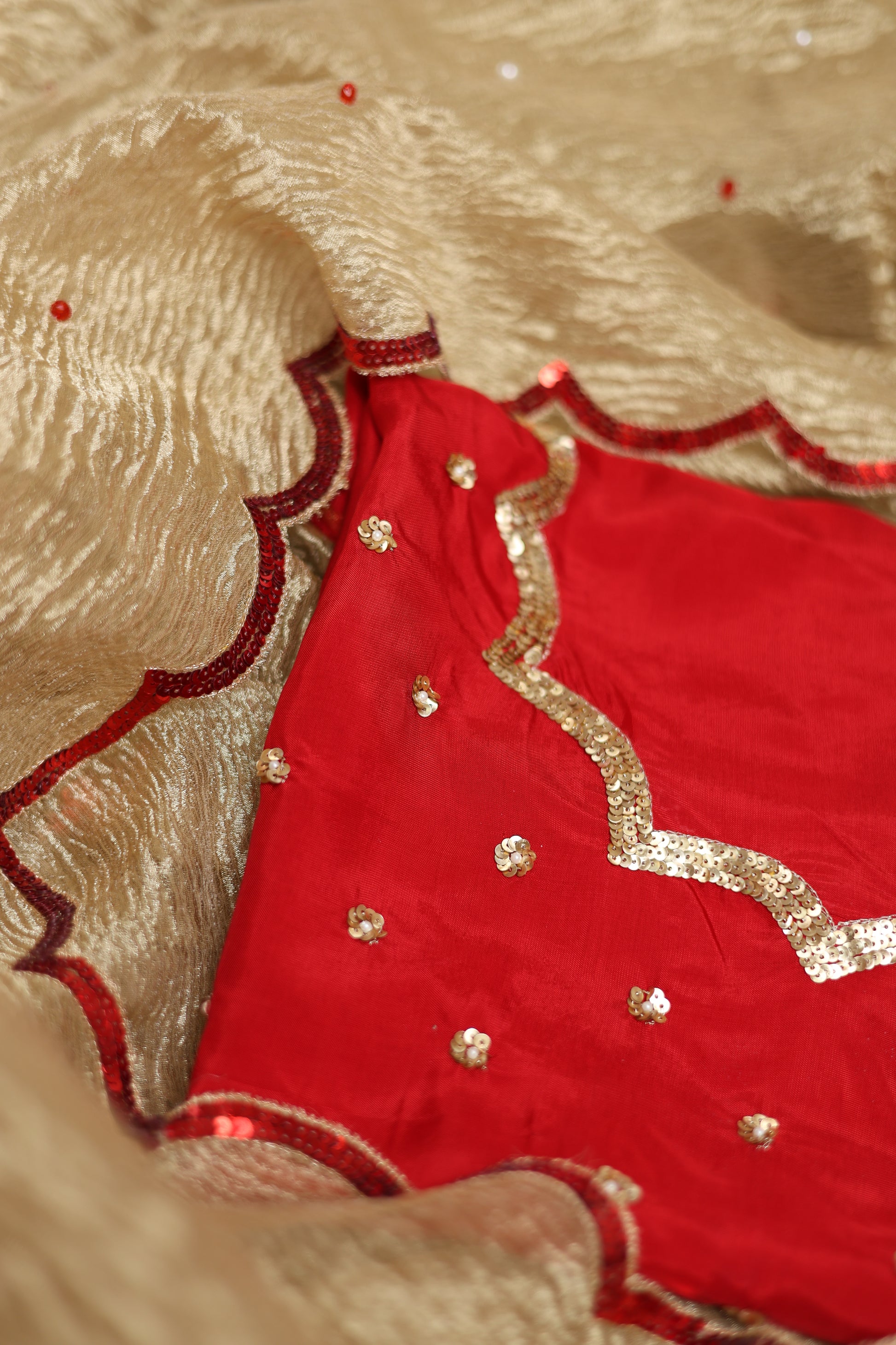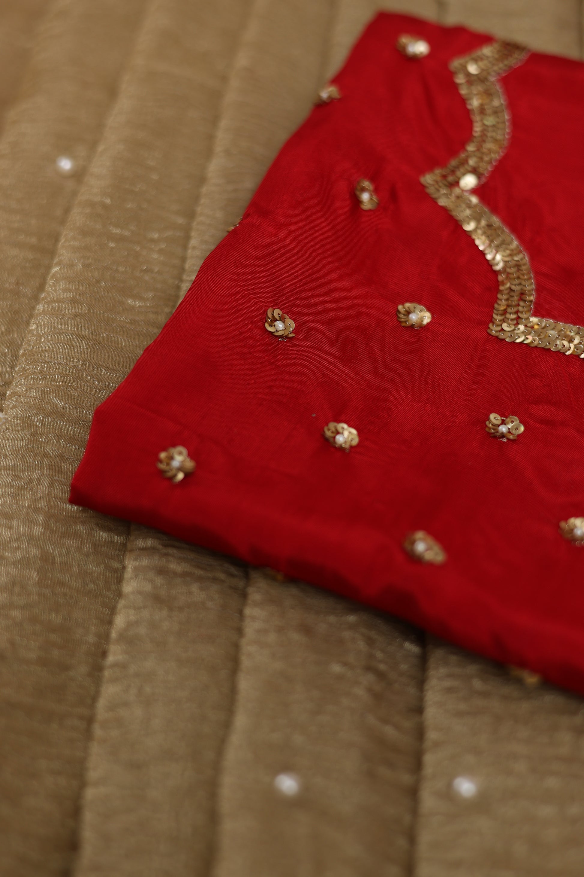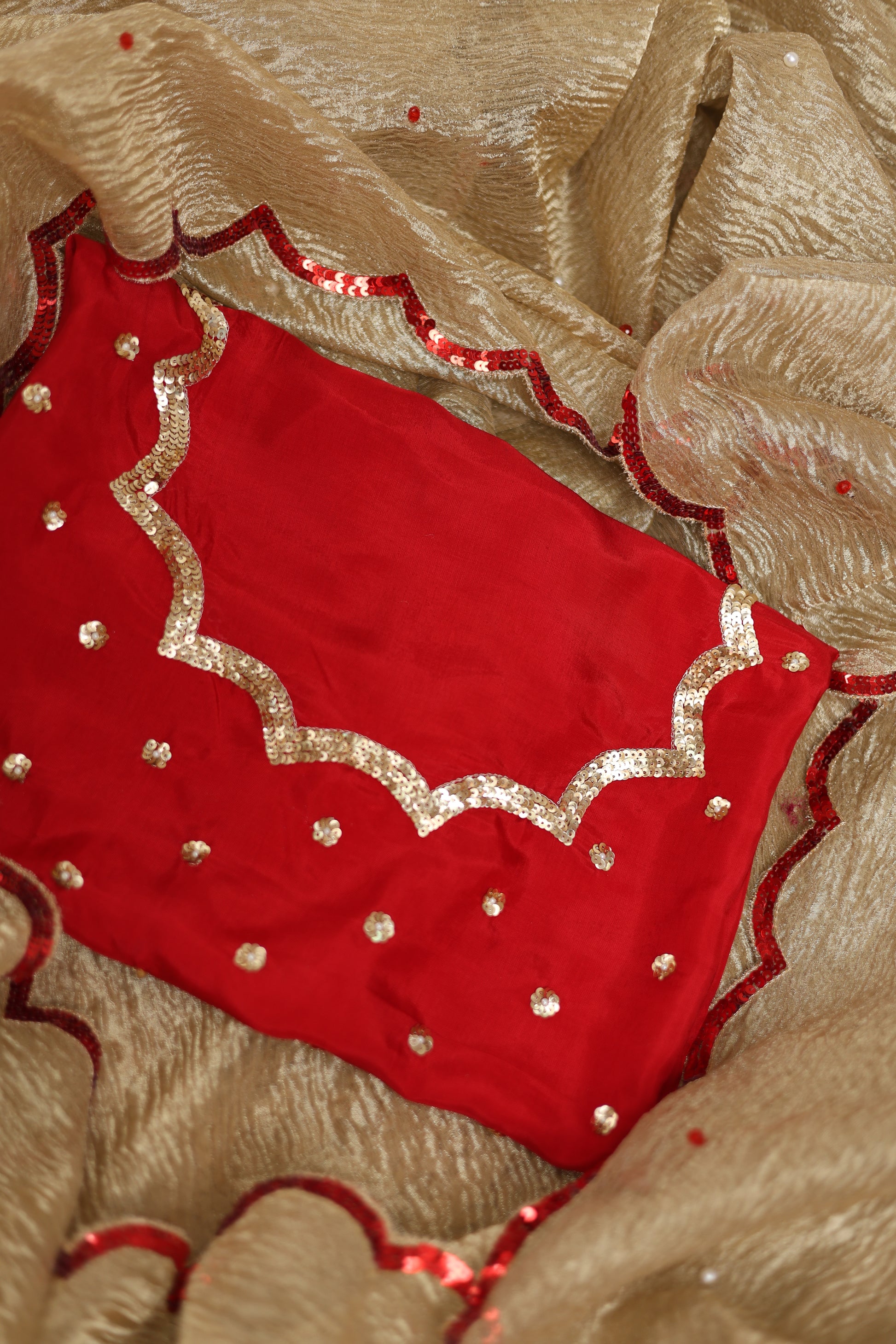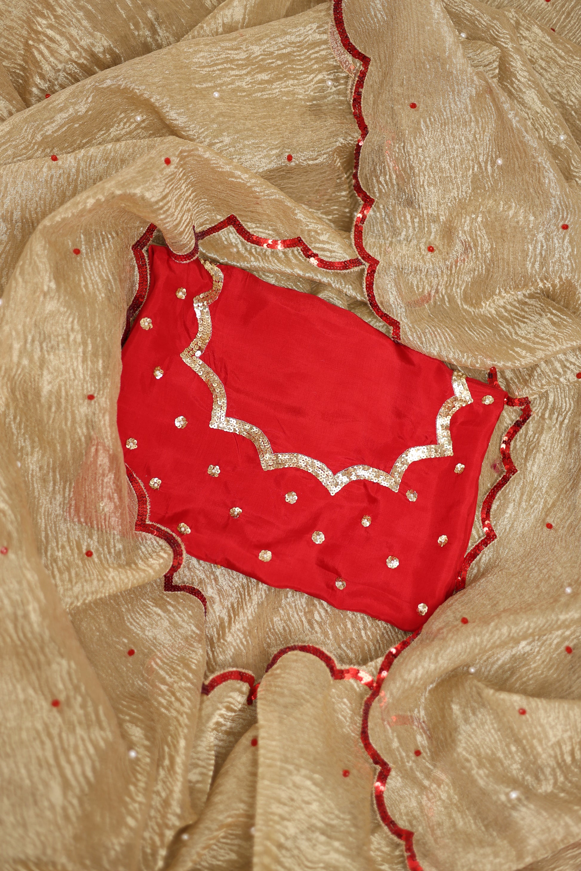 A vision in contrast, where tradition meets timeless allure — The Golden Haze saree, with its soft, golden shimmer, is elevated to regal heights when paired with a rich, intricately handworked red blouse. Together, they weave a tale of bold elegance and quiet grace. The gold floats like mist at dawn, while the red blouse stands proud like an ember that refuses to fade — powerful, radiant, unforgettable. Perfect for festive evenings, grand weddings, or any moment that deserves to be etched in gold and crimson. ✨❤️🌾